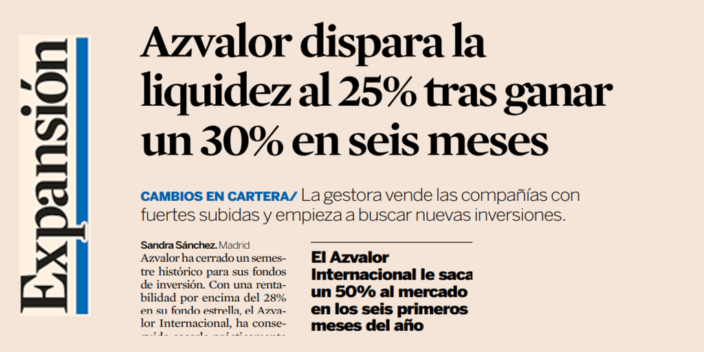 Azvalor dispara la liquidez al 25% tras ganar un 30% en seis meses CAMBIOS EN CARTERA/ La gestora vende las compañías con fuertes subidas y empieza...