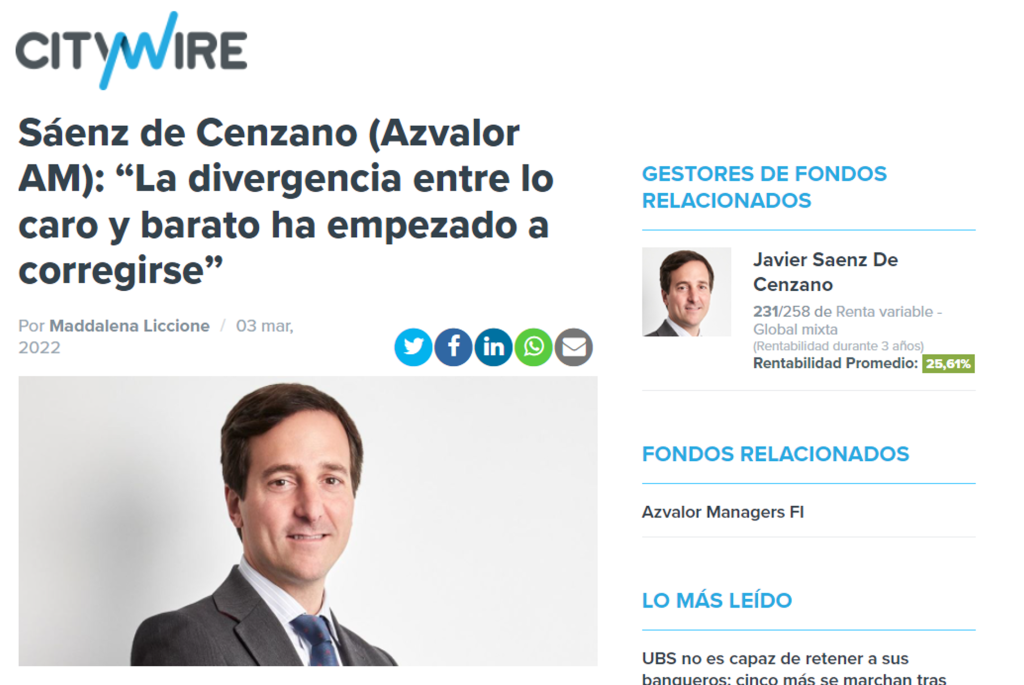"La divergencia entre lo caro y barato ha empezado a corregirse", Javier Sáenz de Cenzano en Citywire