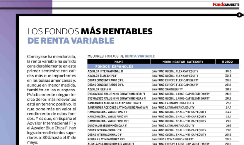 Los fondos de Azvalor se sitúan como los mejor clasificados entre todos los productos españoles