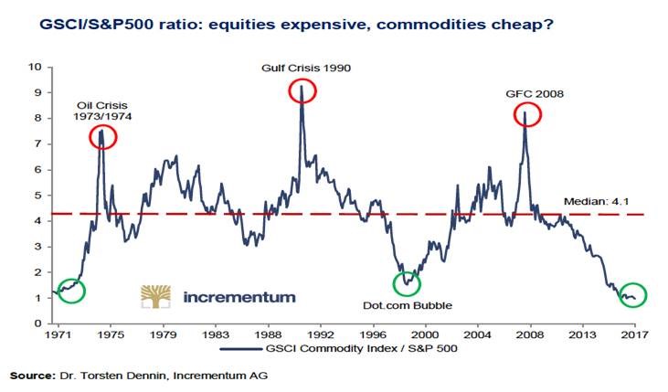 To this day we have about 18% in commodities companies (copper, uranium and nickel), close to 14% in gold mining companies and about 20% in the energy sector. Thus, again more than half of the portfolio is invested in raw material companies (like at the beginning of 2016). These weighed 14% in the S&P500 index in 1980 and today they barely weigh 3%, the minimum level in the past 40 years. In our opinion, this indicates excessive pessimism on the part of investors towards a sector which actually presents excellent growth prospects, based on the increasing urbanization of emerging countries. The graph below shows the magnitude of the current underestimation of this sector from a historical perspective.