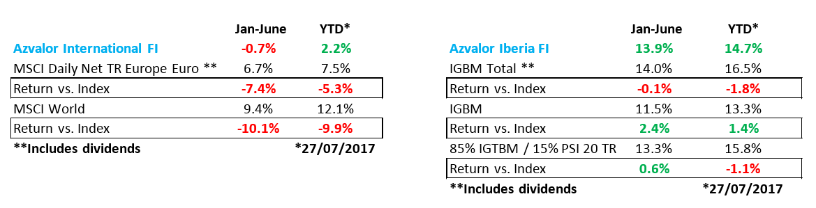 These results have been achieved without exposure to banks (which stock prices have increased significantly) and with a liquidity position close to 20% (liquidity does not yield anything nowadays). Thus, results have been achieved with very significant revaluations across a range of companies. The universe we can invest in for this fund (about 100 Spanish and Portuguese companies) is much more limited than in Azvalor Internacional (over 10,000!) and this is clearly a drawback. However, we are closer to them and know them better and, consequently, the error rate is smaller. We hope to continue making the most of our knowledge and contact with these firms in the future, with very clear purchasing and sales levels for each of them, in order to obtain as much return possible given market swings.