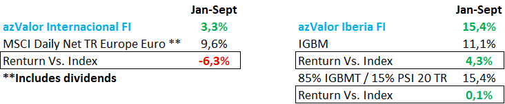 In our previous letter, we quoted Buffett when he said that “holding cash is uncomfortable but not as uncomfortable as doing something stupid”. At the end of the 2Q we had 22% cash in our Iberian portfolio. As we always said, situations like this are temporary as the market usually does not take too long to create investment opportunities. This is exactly what happened during the 3Q as we reduced cash to 15% by of the end of September.