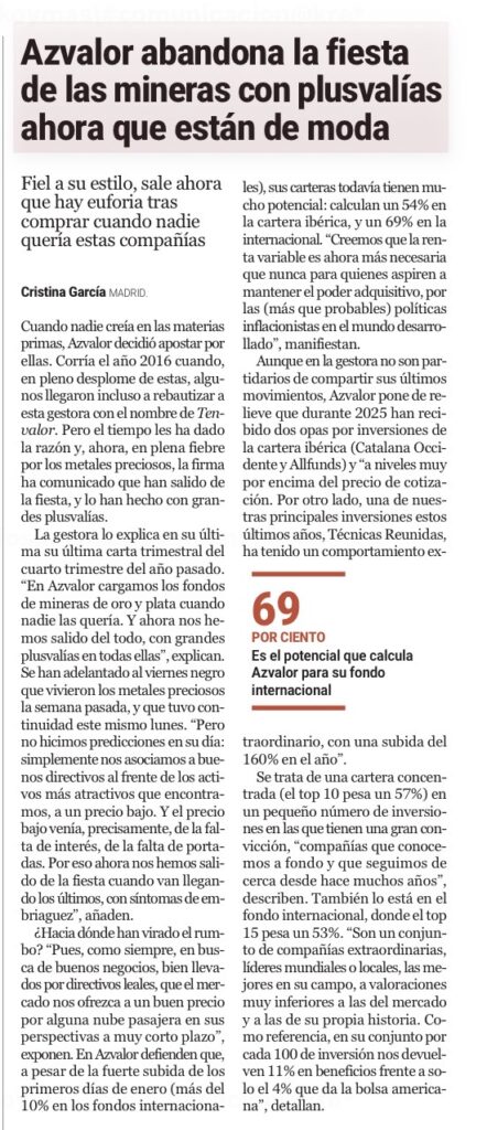 La gestora lo explica en su última su última carta trimestral del cuarto trimestre del año pasado. «En Azvalor cargamos los fondos de mineras de oro y plata cuando nadie las quería. Y ahora nos hemos salido del todo, con grandes plusvalías en todas ellas«, explican. Se han adelantado al viernes negro que vivieron los metales preciosos la semana pasada, y que tuvo continuidad este mismo lunes. «Pero no hicimos predicciones en su día: simplemente nos asociamos a buenos directivos al frente de los activos más atractivos que encontramos, a un precio bajo. Y el precio bajo venía, precisamente, de la falta de interés, de la falta de portadas. Por eso ahora nos hemos salido de la fiesta cuando van llegando los últimos, con síntomas de embriaguez», añaden.