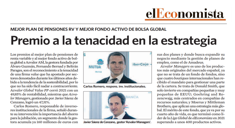 Los premios al mejor plan de pensiones de renta variable y al mejor fondo activo de bolsa global a Azvalor AM, la gestora fundada por Álvaro Guzmán, Fernando Bernad y Beltrán Parages, son el reconocimiento a la tenacidad de una firma value que ha apostado por sectores denostados durante los últimos años debido a la tendencia de la sostenibilidad, por lo que no ha sido fácil nadar a contracorriente. Azvalor Global Value PP cerró 2021 con un 49,85% de rentabilidad, mientras que Azvalor Managers, gestionado por Javier Sáenz de Cenzano, logró un 47,31%.