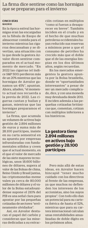 En la época estival las hormigas eran las encargadas en la fábula de Esopo de almacenar comida para el invierno mientras las cigarras descansaban y se divertían, una situación con la que desde la gestora Azvalor dicen sentirse comparados en el actual momento de mercado. “En 2022 las cigarras (el índice S&P 500) perdieron más de un 20% mientras que las hormigas de Azvalor ganamos un 45%”, apuntan. Ahora, añaden, “el momento actual nos recuerda a la previa del 2022. Las cigarras cantan y bailan y ganan, mientras que las hormigas preparamos el invierno”.