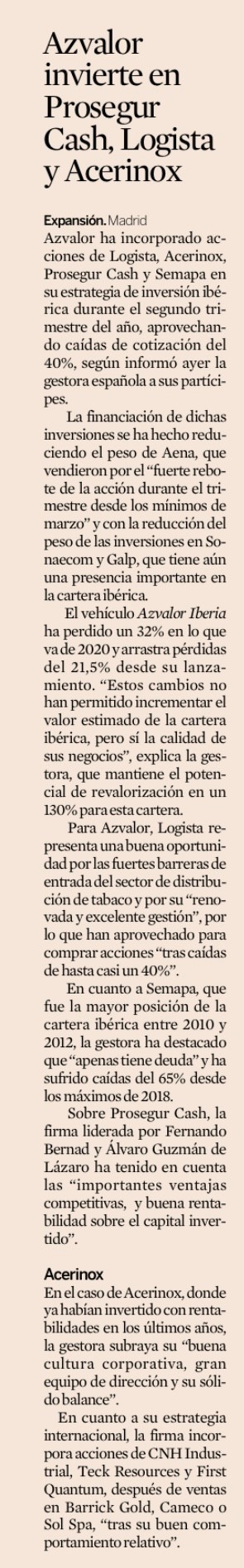 Azvalor ha incorporado acciones de Logista, Acerinox, Prosegur Cash y Semapa en su estrategia de inversión ibérica durante el segundo trimestre del año, aprovechando caídas de cotización del 40%, según informó ayer la gestora española a sus partícipes.