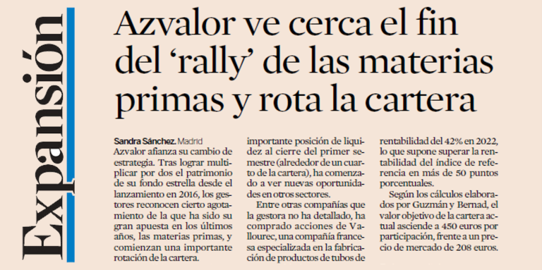 Azvalor afianza su cambio de estrategia. Tras lograr multiplicar por dos el patrimonio de su fondo estrella desde el lanzamiento en 2016, los gestores reconocen cierto agotamiento de la que ha sido su gran apuesta en los últimos años, las materias primas, y comienzan una importante rotación de la cartera.