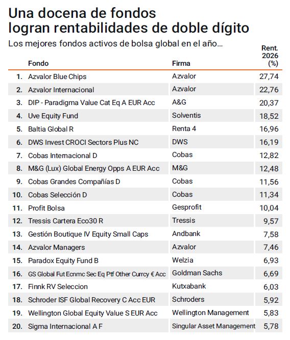 En un contexto de marcada incertidumbre geopolítica y económica, una parte considerable de los fondos de renta variable internacional resiste en positivo en el año. En concreto, de los más de 500 vehículos de inversión colectiva de gestión más activa monitorizados por elEconomista.es, un 18% logra este resultado, con datos a 31 de marzo de Morningstar, aunque con diferencias notables, ya que una decena no solo está evitando las pérdidas sino que está ofreciendo rentabilidades de doble dígito, cuando el MSCI World, el índice más representativo de la bolsa mundial pierde un 2,28% hasta ahora.