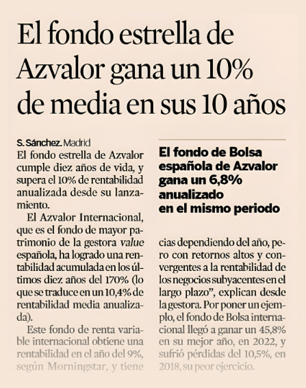 El Azvalor Internacional, que es el fondo de mayor patrimonio de la gestora value española, ha logrado una rentabilidad acumulada en los últimos diez años del 170% (lo que se traduce en un 10,4% de rentabilidad media anualizada).