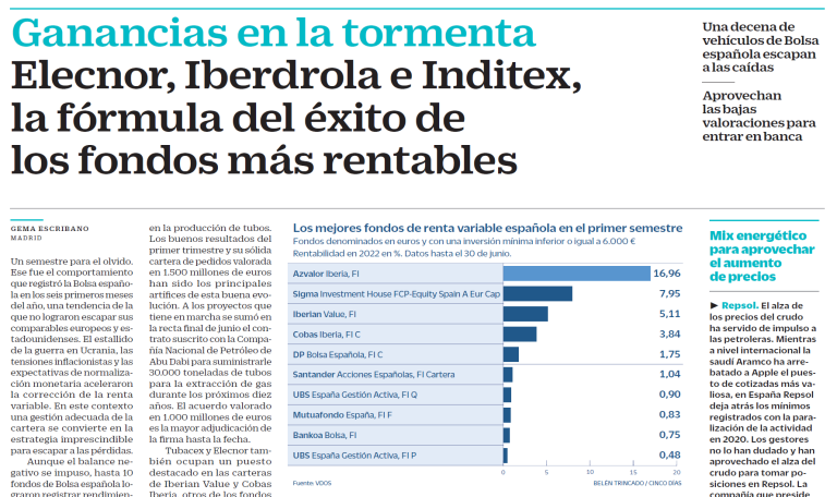 Según datos recopilados por Morningstar, el sector industrial y las materias primas son las principales exposiciones del fondo. Traducido esta estrategia a valores, las cinco mayores posiciones del fondo las ostentan Elecnor, Tubacex y Técnicas Reunidas, cotizadas que hasta el 30 junio escaparon a las caídas y algunas incluso lograban una revalorización superior al 55%. Es el caso de la empresa vasca especializada en la producción de tubos.