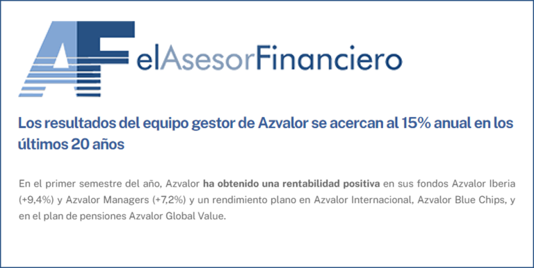 En el primer semestre del año, Azvalor ha obtenido una rentabilidad positiva en sus fondos Azvalor Iberia (+9,4%) y Azvalor Managers (+7,2%) y un rendimiento plano en Azvalor Internacional, Azvalor Blue Chips, y en el plan de pensiones Azvalor Global Value.