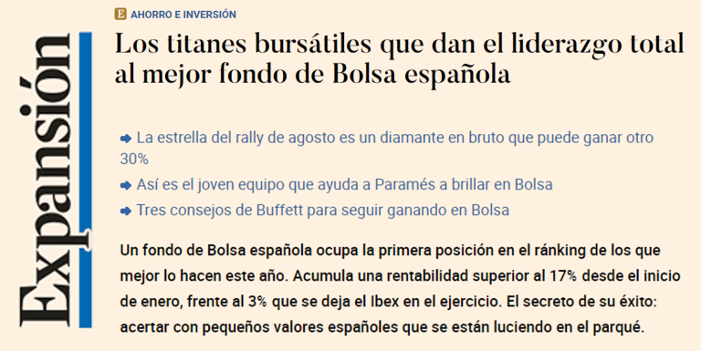 El equipo de Álvaro Guzmán de Lázaro y Fernando Bernard Marrasé explica que la cartera se mantiene concentrada en compañías que conocen bien. Las primeras posiciones son Tubacex, con un peso en la carera del 9,52%, Técnicas Reunidas (9,33%), Elecnor (6,9%), Logista (6,27%) y Prosegur Cash (6,24%).