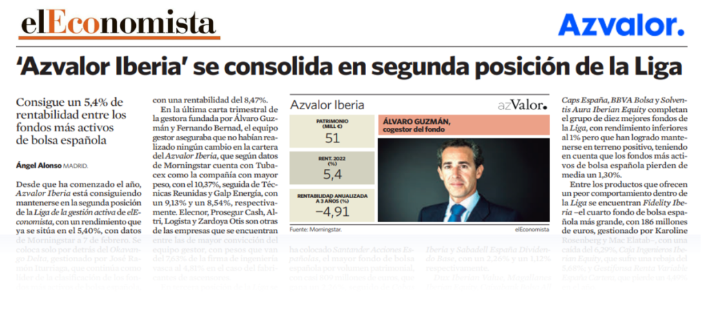 Azvalor Iberia en la segunda posición de la "Liga de la gestión activa" de elEconomista
